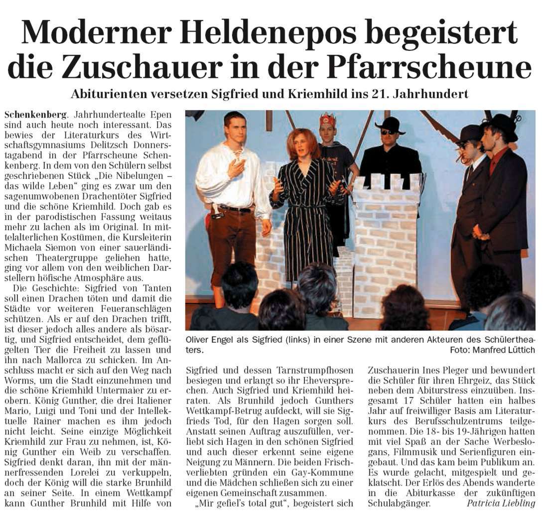 Die Nibelungen – oder das wilde Leben Geposted am13. März 200828. September 2015AutorPfarrscheune Schenkenberg Präsentiert vom Literaturkurs des Wirtschaftsgymnasiums Delitzsch. LVZ Artikel vom 15.03.2008